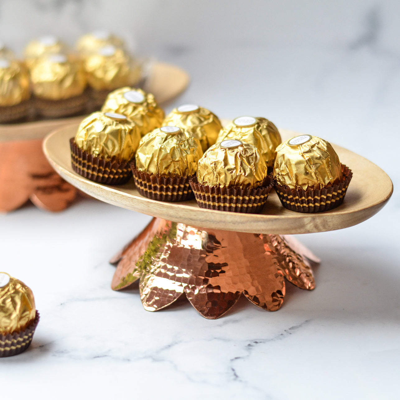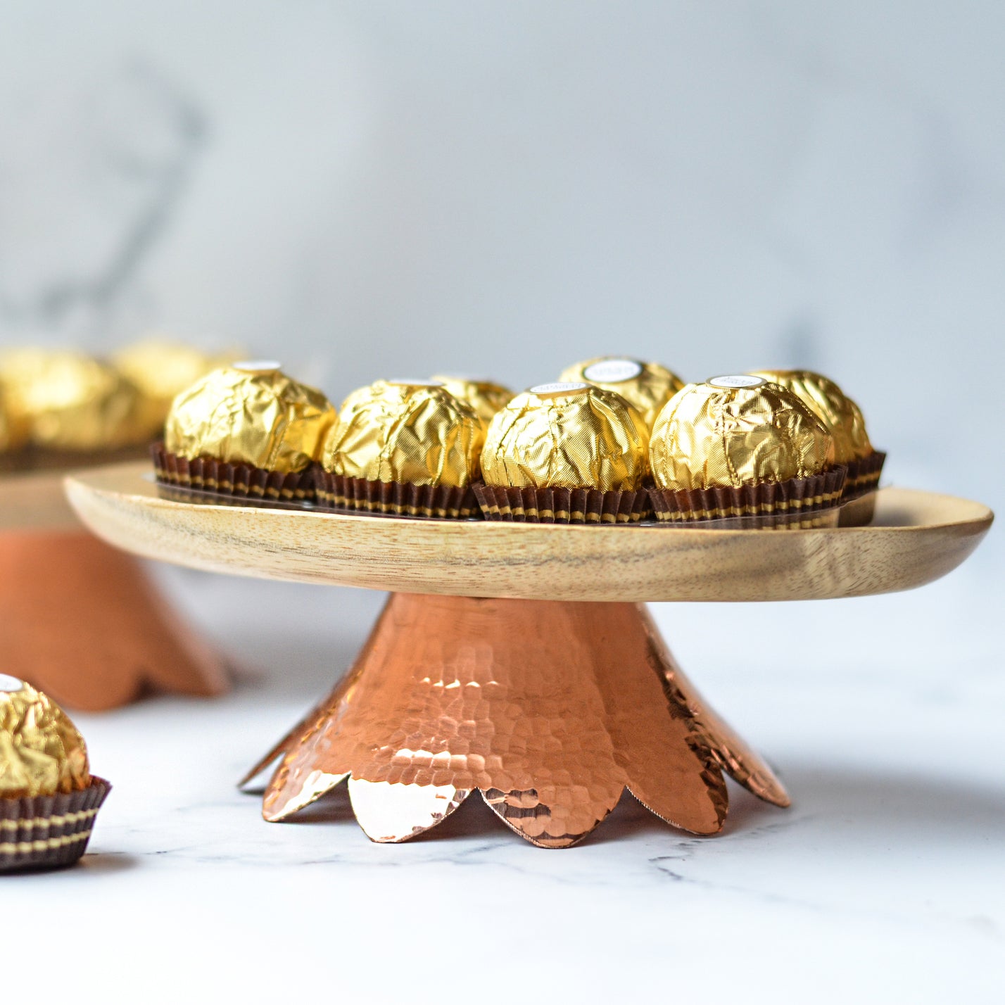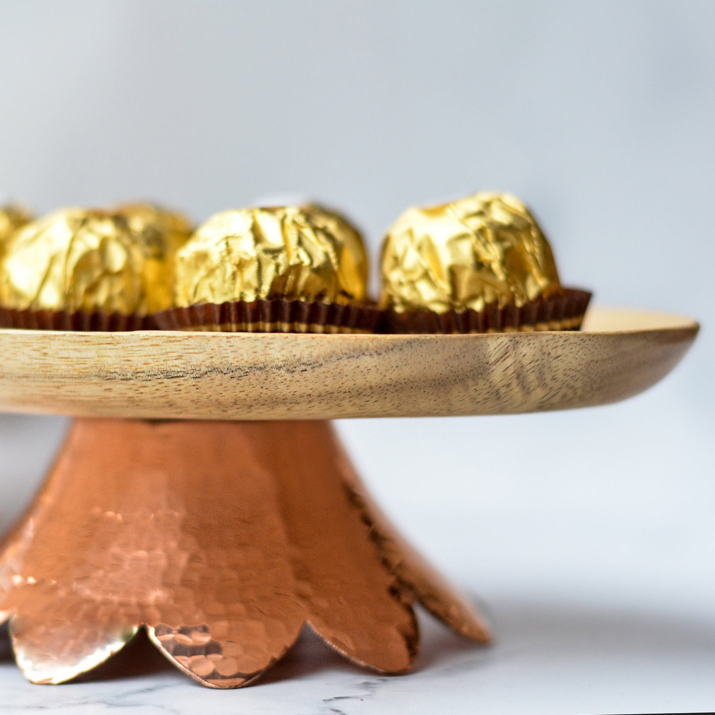 Bring forth a mixture of nature’s raw tones on the table with this serve ware which is a blend of wood and hand beaten metal. The copper/brass flower shaped base adds elegance to the mini platter. It can also be used to serve cupcakes and cookies for a tea party setting.